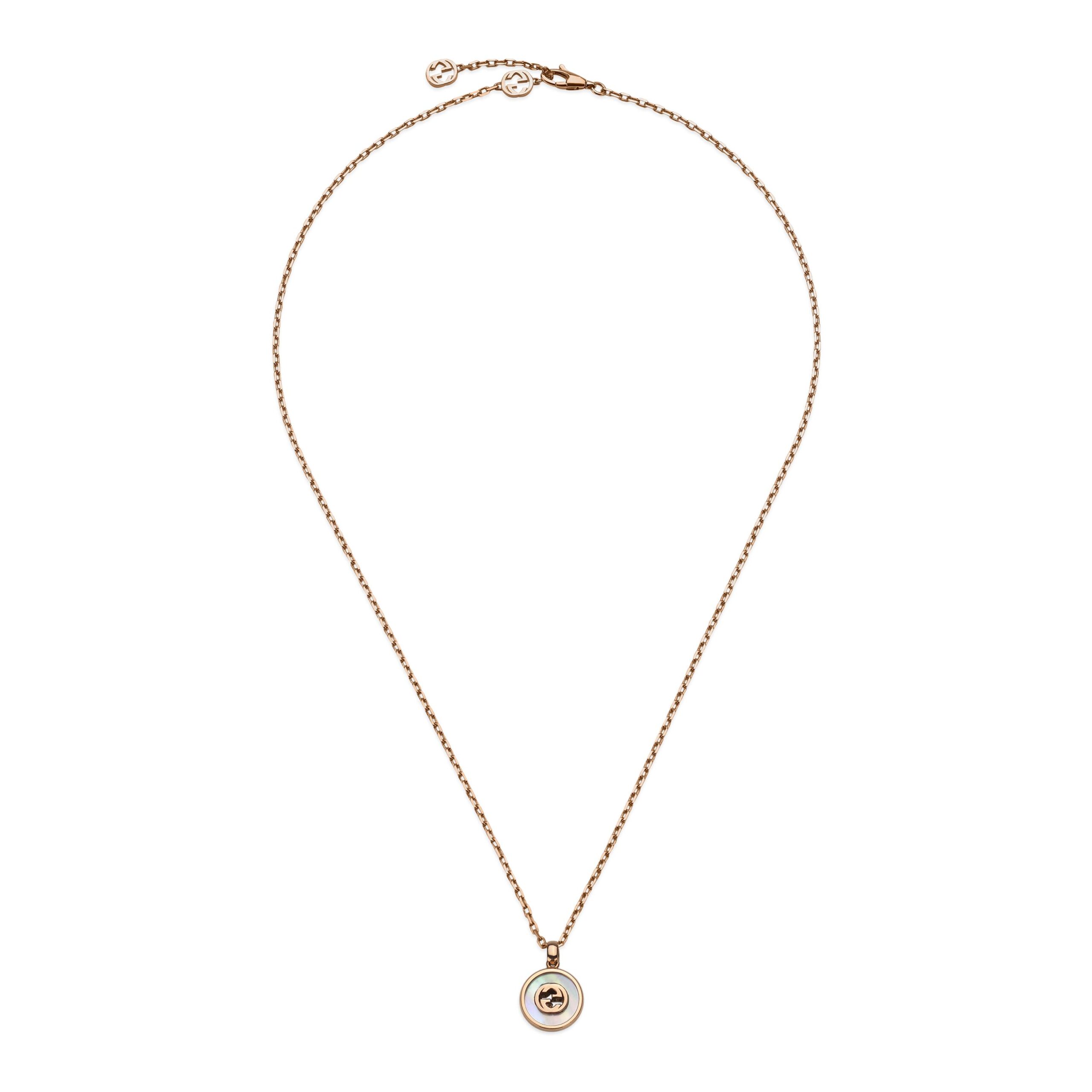 Collana Gucci Interloking in oro rosa con pavé di diamanti, pendente da 12 mm e lunghezza regolabile 42-45cm.