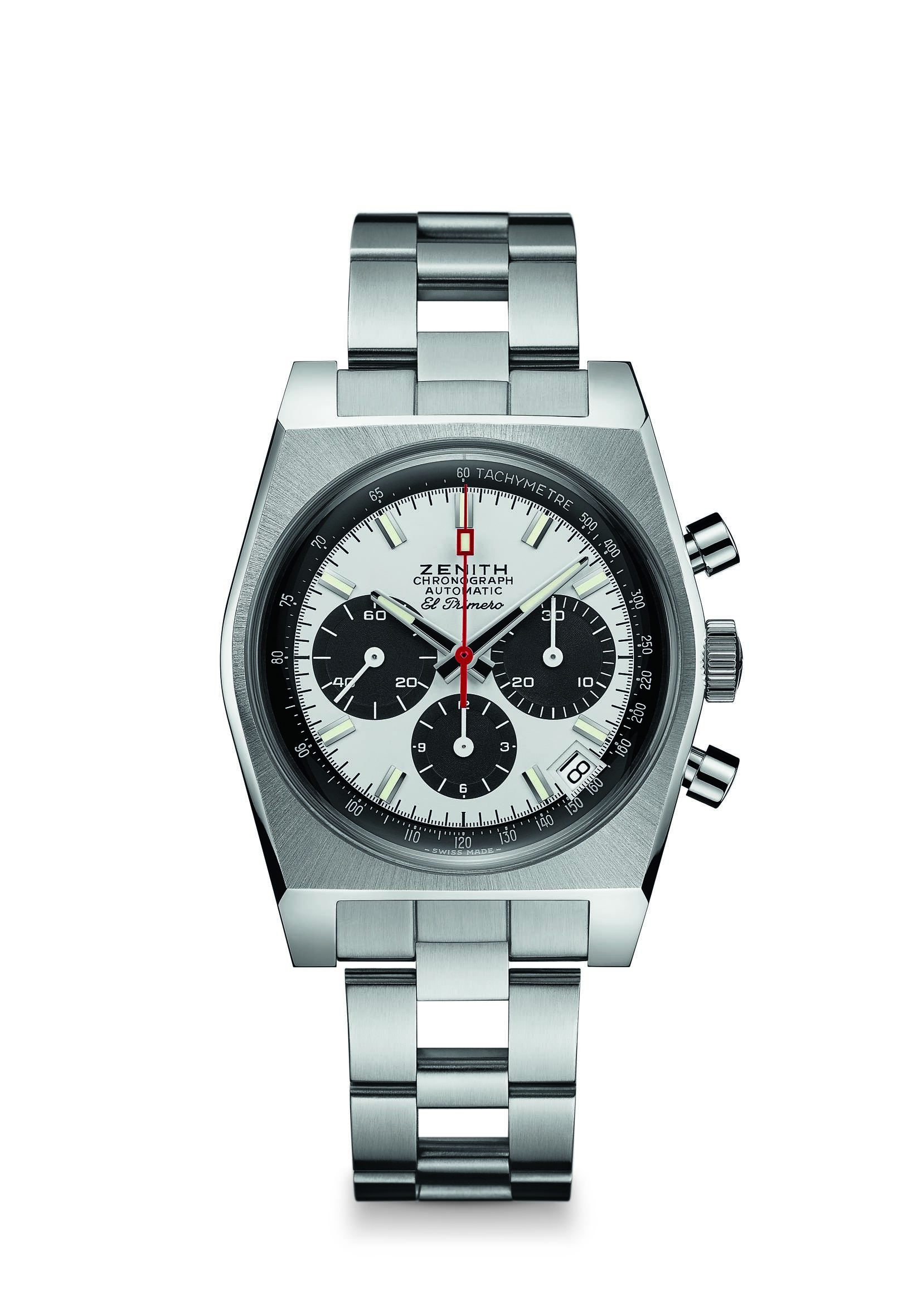 Abbinato a un bracciale in acciaio effetto “scala”, il Chronomaster El Primero A384 Revival è una fedele riproduzione del primissimo orologio Zenith in acciaio dotato del calibro cronografico automatico ad alta frequenza El Primero del 1969. La cassa di forma tonneau e il quadrante “panda” sono ricreati seguendo i progetti di produzione originali.